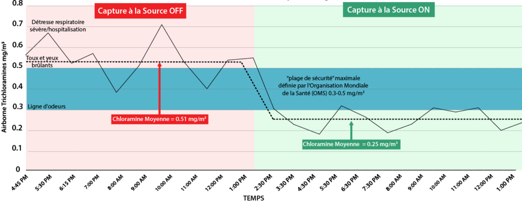 L’utilisation de la Capture à la Source permet de ramener rapidement les niveaux de trichloramine bien en dessous de la fourchette de sécurité déterminée par l’Organisation mondiale de la santé (OMS).
